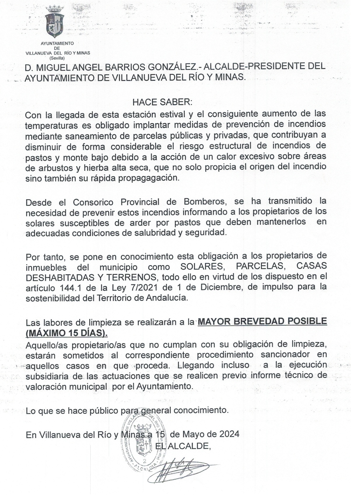 COMUNICACIÓN VECINDARIO OBLIGACIÓN DE LIMPIEZA PARA PREVENCIÓN DE INCENDIOS